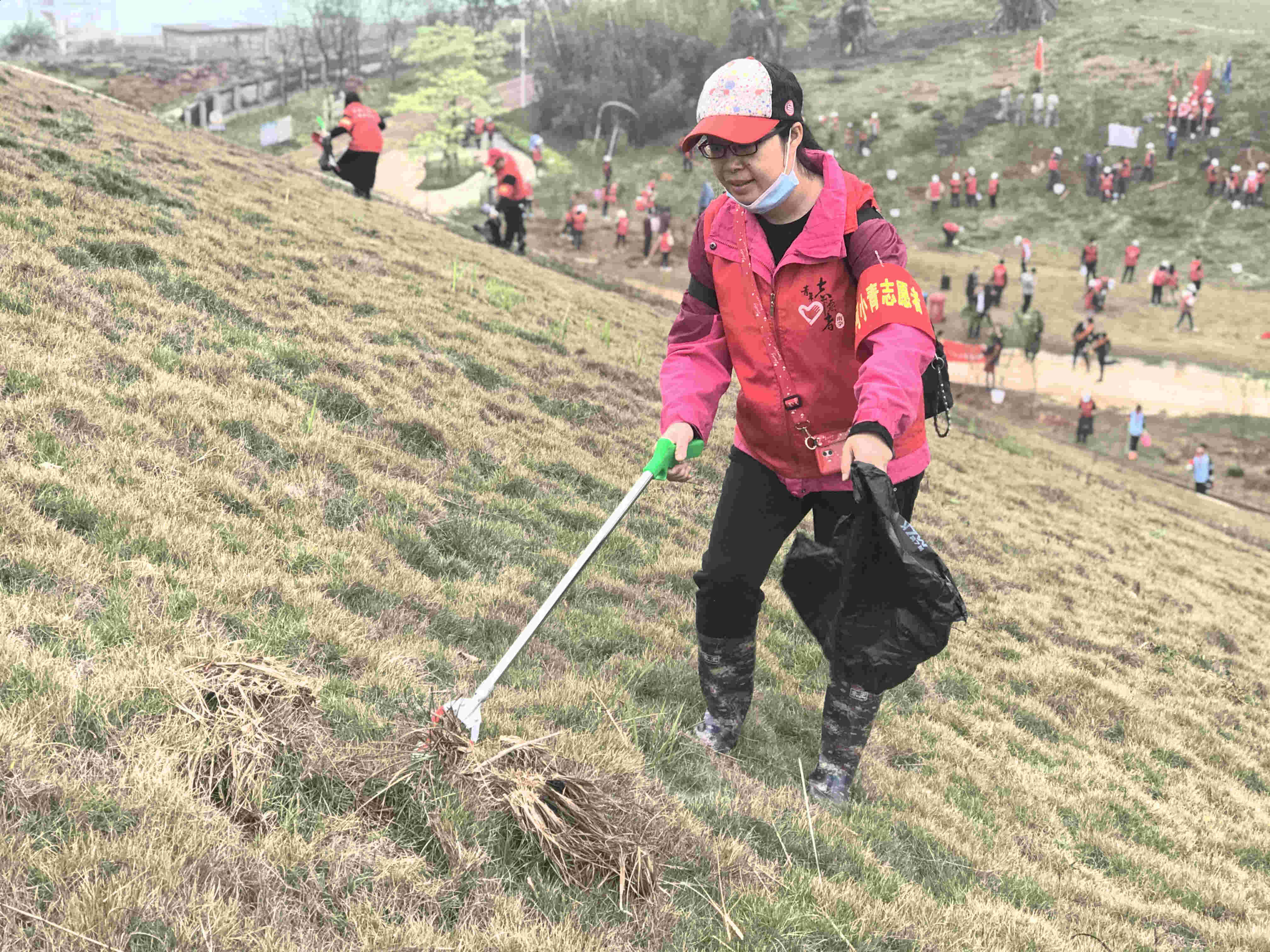 上午9时,志愿者们身着志愿服,佩戴党徽,一个个英姿飒爽,春风满面。在活动现场,你铲土我立苗她浇水,各司其职,默契配合,每一道工序都一丝不苟。同志们踩在泥泞的斜坡上,却没让树苗有一丝丝倾斜。经过一个上午的辛勤栽种,一株株桃树苗在老口枢纽傲然挺立,放眼望去,春意盎然。