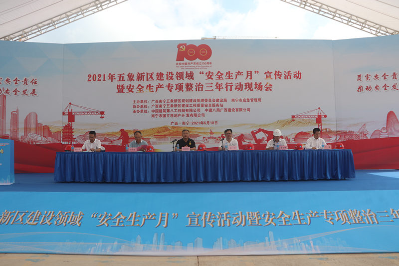 为推进南宁市五象新区建筑施工安全生产专项整治三年行动集中攻坚和安全生产宣传“五进”工作,进一步强化建筑施工安全监管,营造浓厚的安全氛围,2021年6月18日上午,威宁青运村项目顺利开展2021年五象新区建设领域“安全生产月”宣传活动暨安全生产专项整治三年行动会。