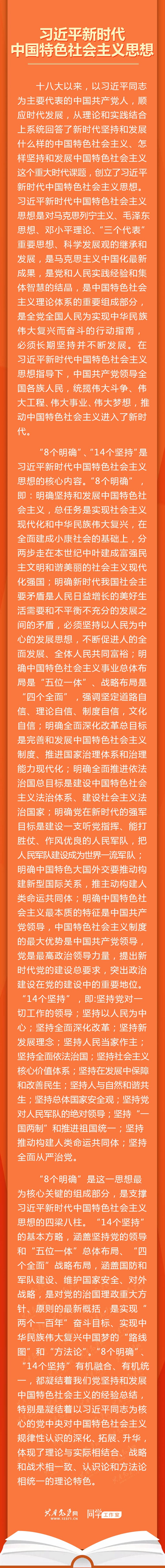 十八大以来,以习近平同志为主要代表的中国共产党人,顺应时代发展,从理论和实践结合上系统回答了新时代坚持和发展什么样的中国特色社会主义、怎样坚持和发展中国特色社会主义这个重大时代课题,创立了习近平新时代中国特色社会主义思想。习近平新时代中国特色社会主义思想是对马克思列宁主义、毛泽东思想、邓小平理论、“三个代表”重要思想、科学发展观的继承和发展,是马克思主义中国化最新成果,是党和人民实践经验和集体智慧的结晶,是中国特色社会主义理论体系的重要组成部分,是全党全国人民为实现中华民族伟大复兴而奋斗的行动指南,必须长期坚持并不断发展。在习近平新时代中国特色社会主义思想指导下,中国共产党领导全国各族人民,统揽伟大斗争、伟大工程、伟大事业、伟大梦想,推动中国特色社会主义进入了新时代。
