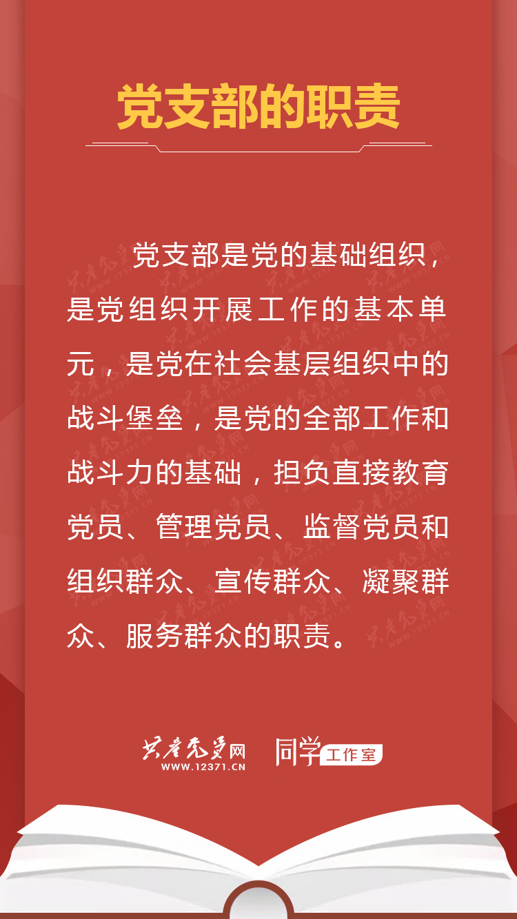 第三十四条 党支部是党的基础组织,担负直接教育党员、管理党员、监督党员和组织群众、宣传群众、凝聚群众、服务群众的职责。