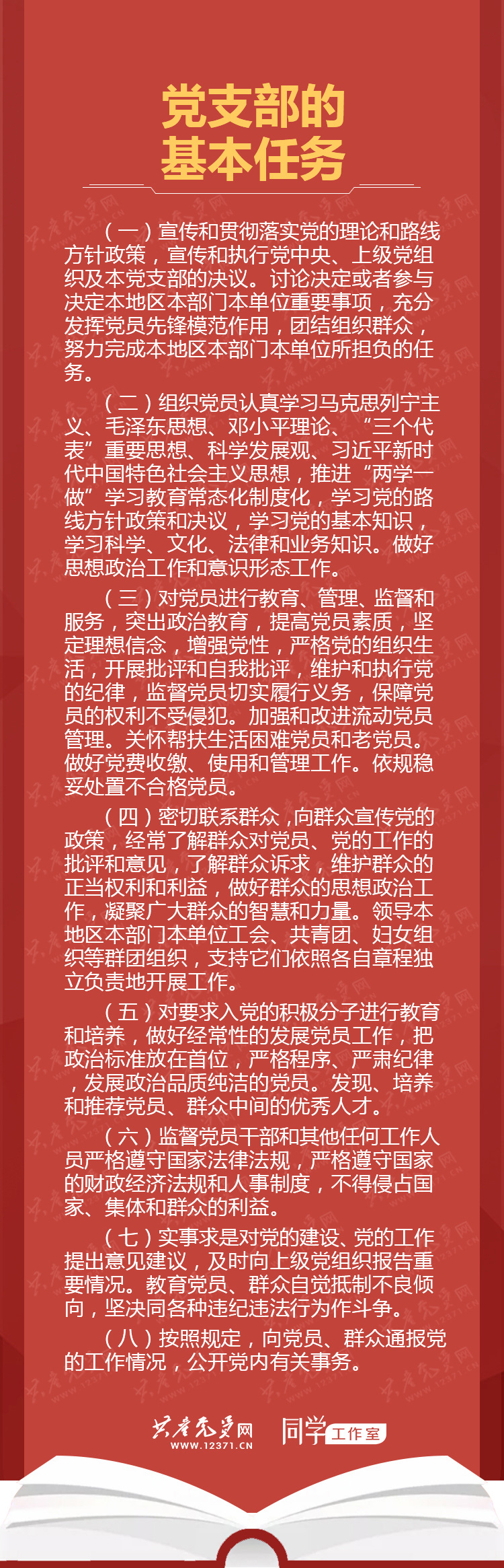 (一)宣传和执行党的路线、方针、政策,宣传和执行党中央、上级组织和本组织的决议,充分发挥党员的先锋模范作用,积极创先争优,团结、组织党内外的干部和群众,努力完成本单位所担负的任务。