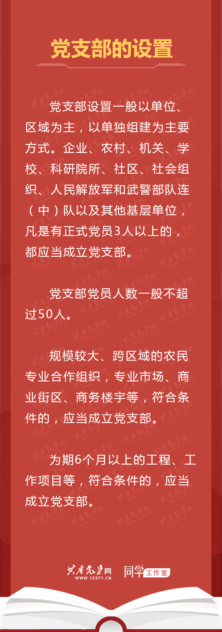 第三十条 企业、农村、机关、学校、科研院所、街道社区、社会组织、人民解放军连队和其他基层单位,凡是有正式党员三人以上的,都应当成立党的基层组织。